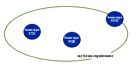The designs 'beam type XYZ' and 'beam type PQR' both satisfy 'my beam requirement because each individual product to these designs satisfies the requirement. The design 'beam type UVW' does not satisfy the requirement because its manufacturing tolerances are too broad. Some individual products to this design meet the requirement, but some do not.